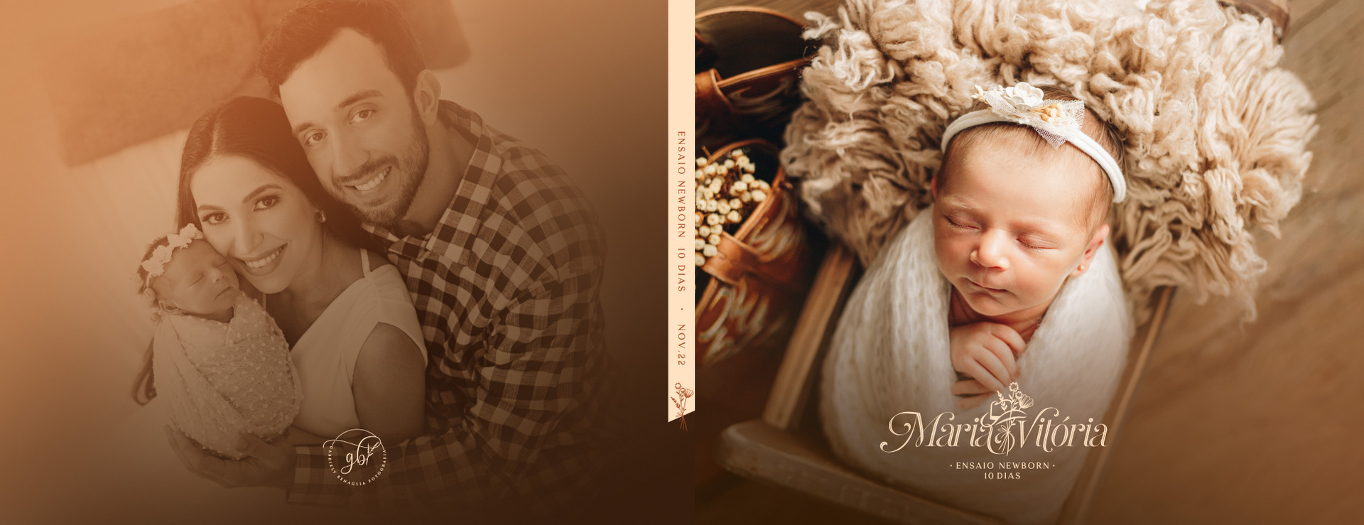 Identidade criada para o álbum de newborn da Maria Vitória. O papai da Maria ama o universo country, então tilizamos um chapéu e uma flor para deixar mais delicado e feminino dando um sentido especial para esse álbum.